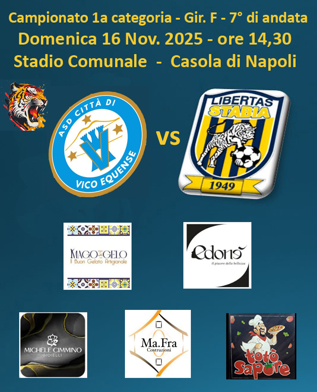 Domani in prima categoria si gioca la 7 giornata di campionato. La Libertas Stabia di patron Pacifico gioca a Casola con il Città di Vico Equense. La formazione stabiese sembra in ripresa rispetto a qualche settimana fa culminate con l’esonero dell’allenatore Pasquale Napodano sostituito in panchina da Luca Esposito. Comunque domani sul campo neutro di Casola i “tigrotti” contano di continuare a vincere dopo il successo scacciacrisi di domenica scorsa in casa per 4-1 sul SantEgidio