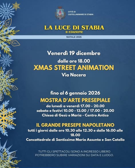 Luci di Stabia, II Edizione, si comincia domani. Animazione per grandi e piccini lungo via Nocera e in Villa Comunale, gli stand di Slow Food, Botteghe in Strada al Centro Antico e poi ancora musica e mercatini al Cmi e a Piazza Giovanni XXIII nel week end di Luci di Stabia a Castellammare di Stabia. Ecco tutti gli eventi in programma da venerdì 19 a domenica 21 dicembre, aspettando l’arrivo della Fiaccola Olimpica dei Giochi Invernali di Milano-Cortina 2026 che arriverà lunedì 22 dicembre davanti a Palazzo Farnese prima di attraversare parte della città in direzione Marina di Stabia.